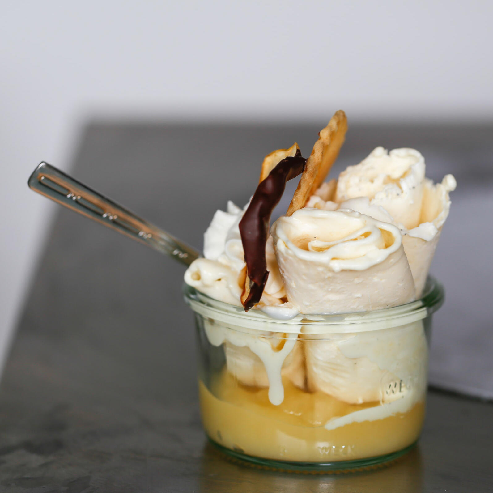 Wir stellen hauptsächlich aus regionalen und saisonalen Produkten Ice Rolls her. Auf einer Kälteplatte wird eine Milch-Rahm-Masse zusammen mit den gewünschten Beigaben (Beeren, Nidletäfeli usw.) zu Glace gefroren und zu unseren Summerröueli gerollt. In einem Glas angerichtet, zusammen mit Nidle, Topping und einem Brätzeli sind die Summerröueli ein Genuss.